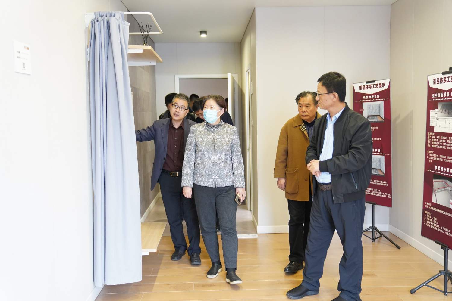 和能人居科技集團總裁閆俊杰帶領調研團隊參觀了全屋裝配式展廳。展廳中的裝飾裝修都是采用全屋部品定制化生產、現場干法裝配,實現了現場無裁切,無噪音施工,從源頭減少建筑垃圾排放,100平米房屋裝修可減少垃圾排放3—4噸,節約能耗70%,碳排放量減少80%。