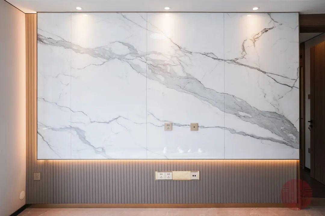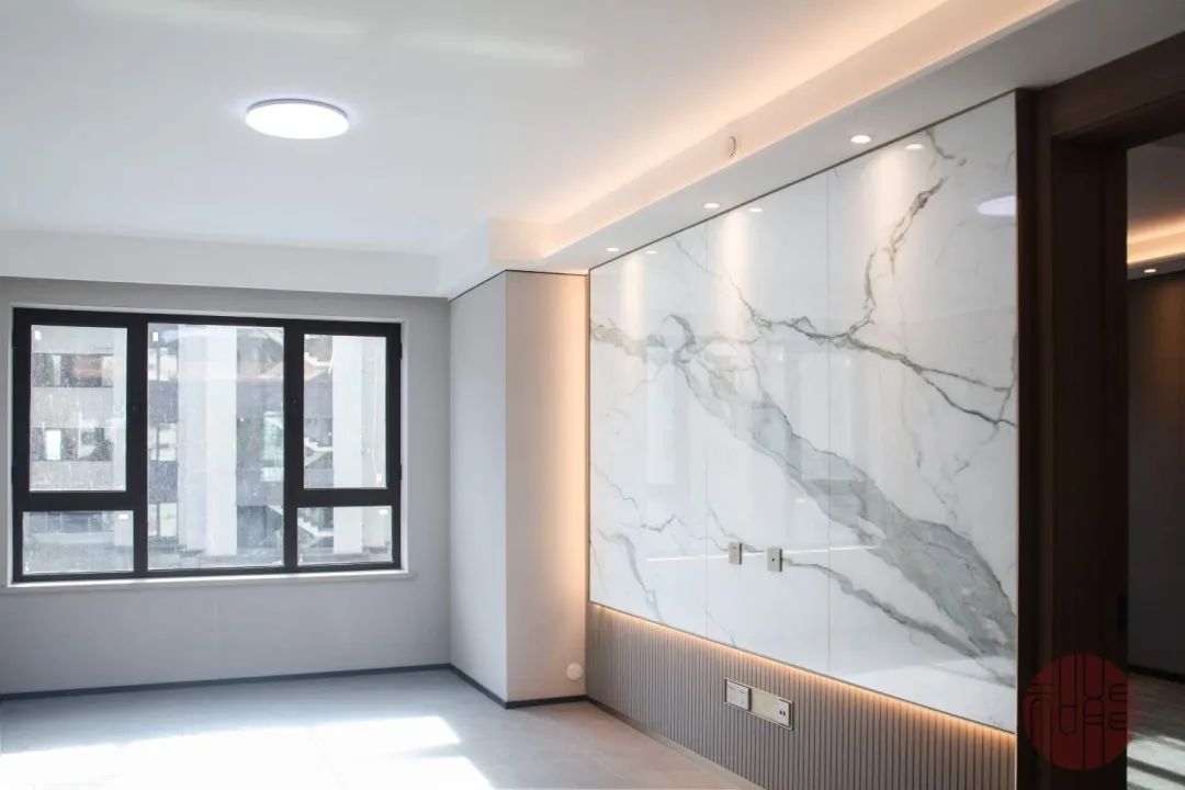 在样板间,即便是简单的墙板也可以千变万化,例如进入龙湖云河砚样板间的第一眼,客厅背景墙即是整个房间的点睛之笔,仿天然纹理的客厅背景墙,在丰富了感官体验的同时,也为客厅融入了自然的气息。这种和能墙板既大气,又显得上档次,与现今流行的岩板背景墙有着异曲同工之妙。
